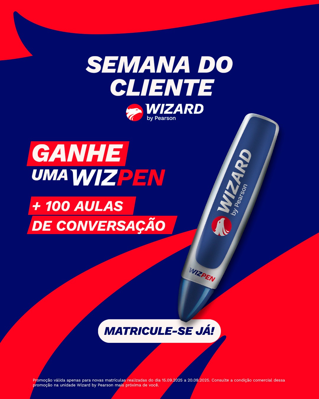 Matricule-se até 20/09 e ganhe 1 Wizpen + 100 aulas de conversação pra turbinar seu aprendizado! 💙📚